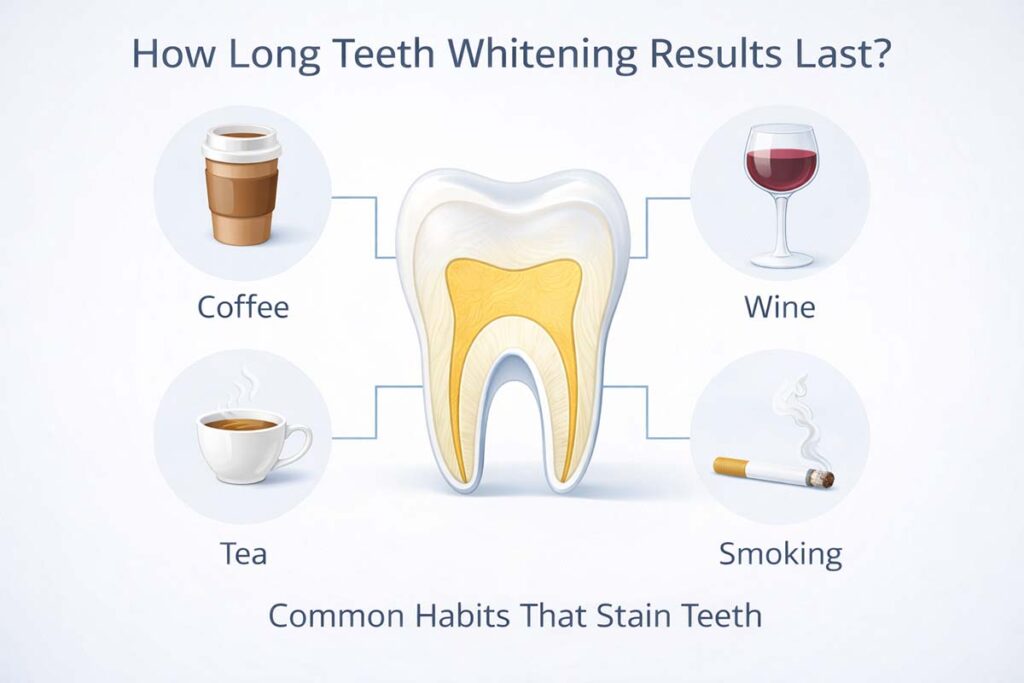 Results vary from person to person. Many patients maintain a brighter smile for six months to two years. Daily habits influence how long whitening lasts. Coffee, tea, tobacco, and dark foods may allow new surface stains to form on enamel over time.