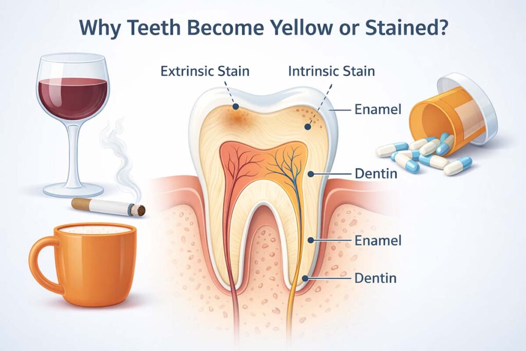 Daily habits often create surface stains. Pigments from food and drinks attach to the outer tooth layer, known as enamel. These stains sit on the surface and may respond well to professional cleaning or whitening.